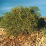 Dense, rounded shrub or tree with thick, fleshy phyllodes (leaves) and deep golden flowers.
